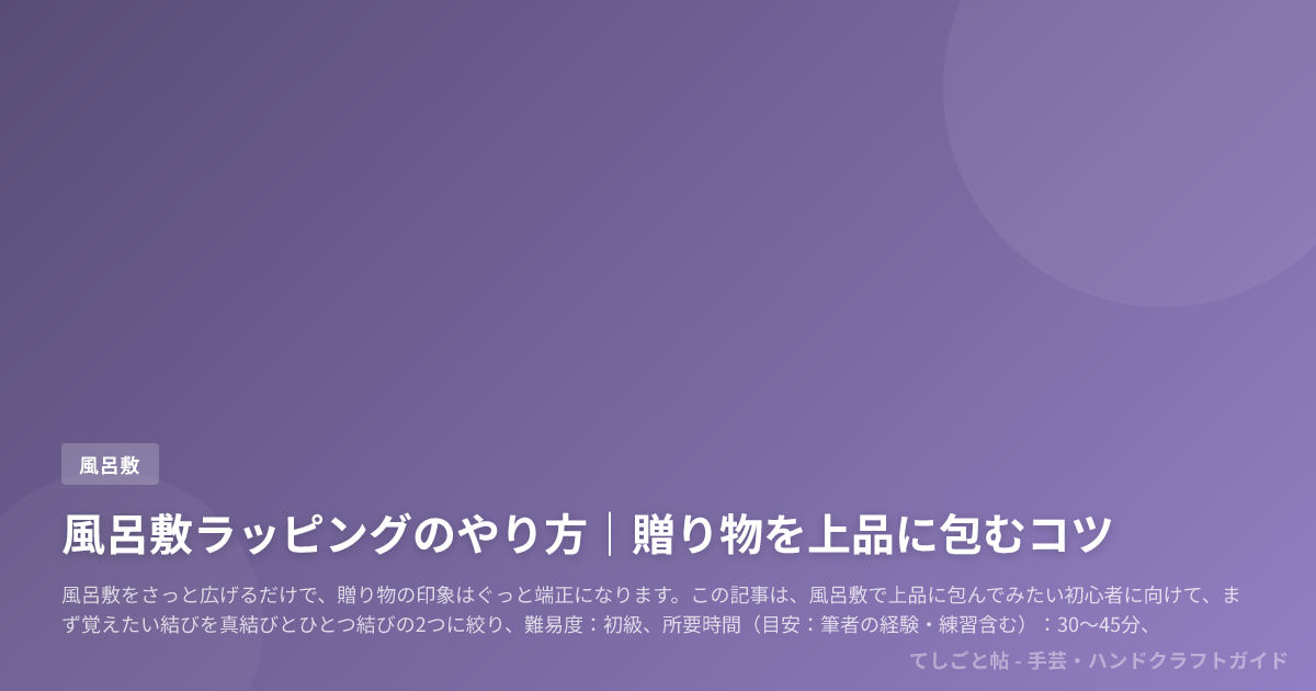 この記事は、風呂敷で上品に包んでみたい初心者に向けて、まず覚えたい結びを真結びとひとつ結びの2つに絞り、難易度:初級、所要時間(目安:筆者の経験・練習含む):30〜45分、材料費の目安(筆者の購入例):約1,000〜2,500円(68〜70cmの綿またはポリエステル1枚を想定)で始める全体像をまとめたものです。