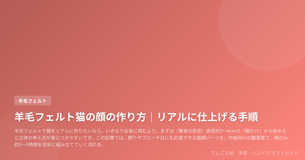 羊毛フェルトで猫をリアルに作りたいなら、いきなり全身に挑むより、まずは(筆者の目安)直径約3〜4cmの「顔だけ」から始めると立体の考え方が身につきやすいです。