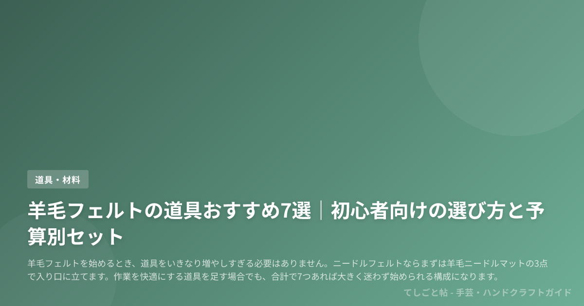 関連記事羊毛フェルトの始め方|道具・材料・基本テクニック- "羊毛フェルト" - "ニードルフェルト" - "道具選び" - "初心者" - "作り方" article_type: 入門・知識ガイド geo_scope: japan specs: product_1: name: "ニードルフェルト" key_features: "専用針で刺して立体を作りやすい。