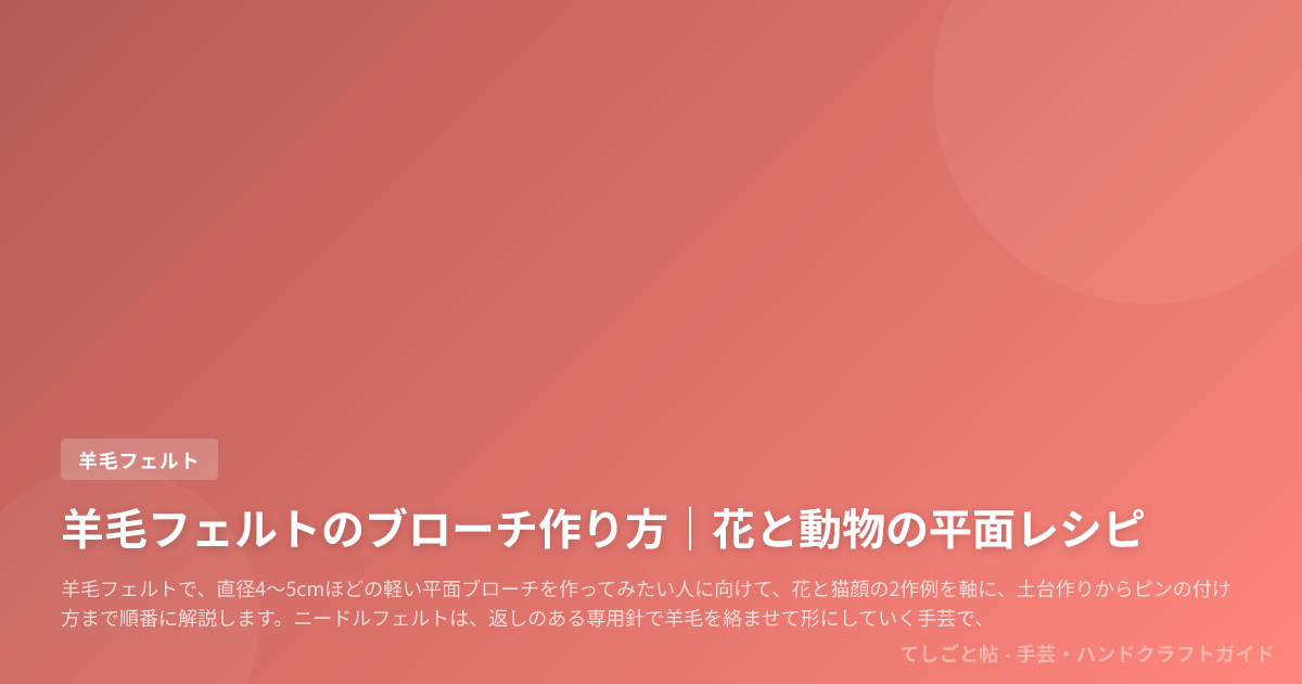 羊毛フェルトで、直径4〜5cmほどの軽い平面ブローチを作ってみたい人に向けて、花と猫顔の2作例を軸に、土台作りからピンの付け方まで順番に解説します。